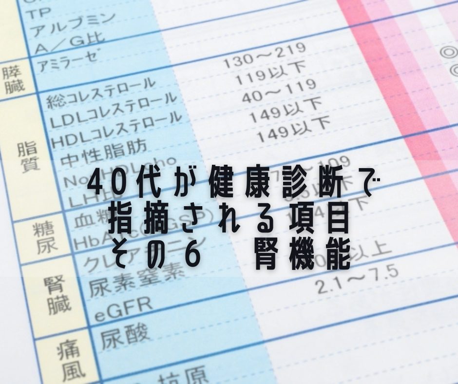 会社員の方だったら、健康診断を毎年受けていると思います。40代は体型も身体の中身も変化しやすい年代と言われていますが、「アラフォーになって指摘を受けた」という方も、「自分は平気かなぁ」と不安になっている方もいるのでは? ということで6回のシリーズにして紹介しています。シリーズ最終回は腎機能です。